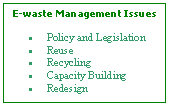 Rationale The past two decades have witnessed an increased momentum in the Information and Communication Technologies (ICT) sector in the Arab region. While this momentum has contributed to increased socio-economic development in many Arab countries, the growing quantity of electronic waste[1] (E-waste) has raised uncomfortable signals. Several E-waste components are considered to pose serious environmental and health hazards, such as lead and cadmium found in circuit boards; lead oxide and cadmium in monitor cathode ray tubes; mercury in switches and flat screen monitors, and cadmium in computer batteries. In the absence of suitable techniques and protective measures, improper handling of E-waste can result in toxic emissions to the air, water and soil and pose a significant health and environmental hazard. Clearly, the need to build capacities for the proper and safe handling methods for E-waste is urgently required. Currently e-waste recycling efforts, particularly in the Arab region, have mostly been limited to random and small scale initiatives. Safe and effective management of E-waste thus remains an untapped opportunity, requiring collaborative and concerted capacity building efforts.